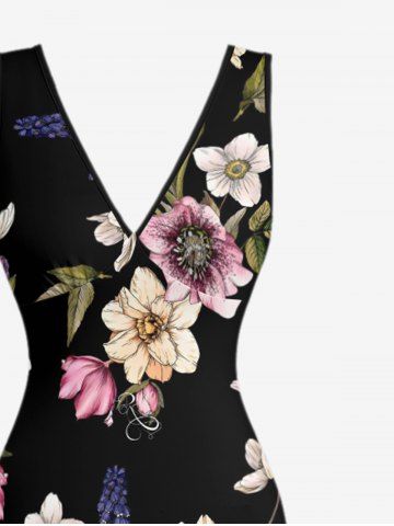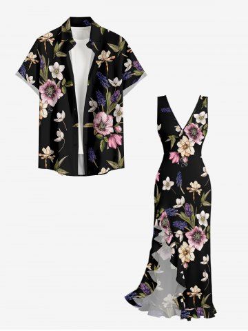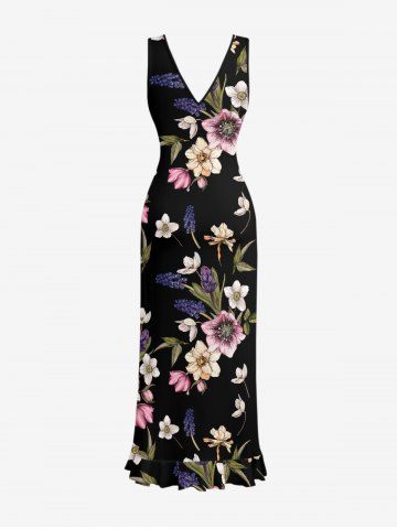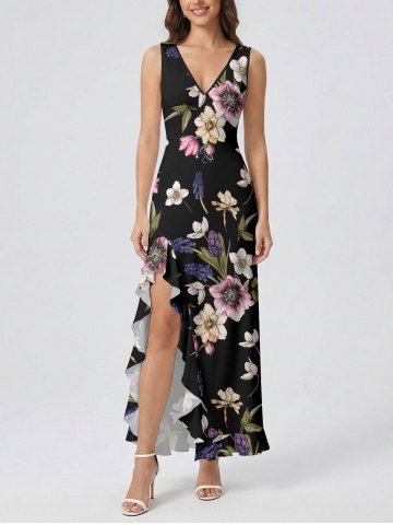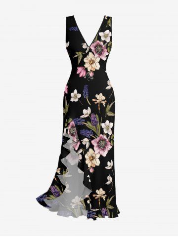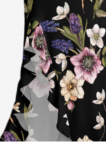 Flower Leaf Print Hawaii Ruffles Split Dress - Black - Xs