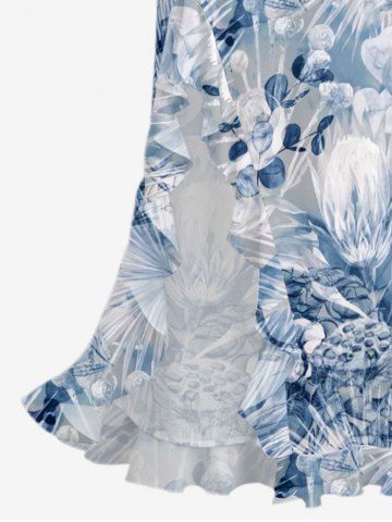 Flower Tropical Leaf Print Hawaii Ruffles Split Surplice Dress - Blue - Xs