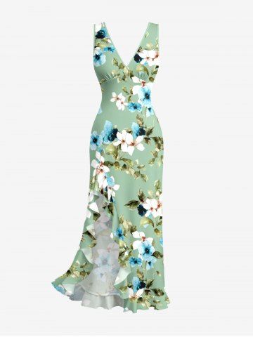 Graphic Dresses > Flowers Leaf Print Hawaii Ruffles Split Surplice Dress