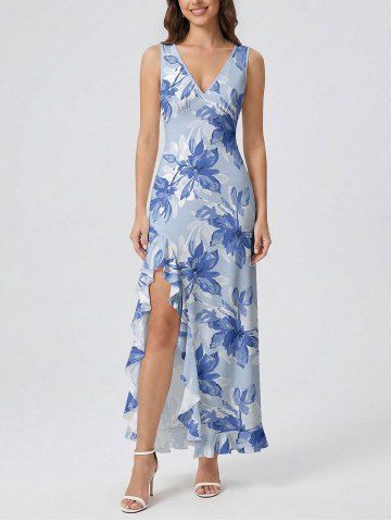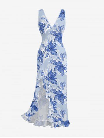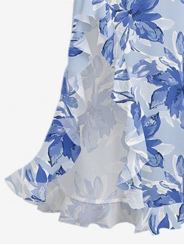 Flowers Leaf Print Hawaii Ruffles Split Surplice Dress - Sky Blue - Xxxl