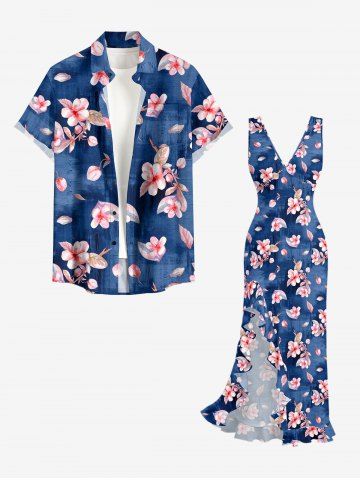 Flowers Leaf Print Hawaii Ruffles Split Surplice Dress - Blue - L