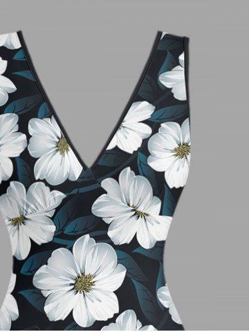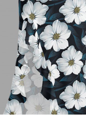 Flowers Leaf Print Hawaii Ruffles Split Surplice Dress - Peacock Blue - M