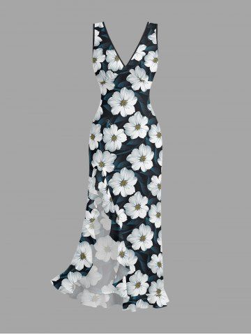 Graphic Dresses > Flowers Leaf Print Hawaii Ruffles Split Surplice Dress