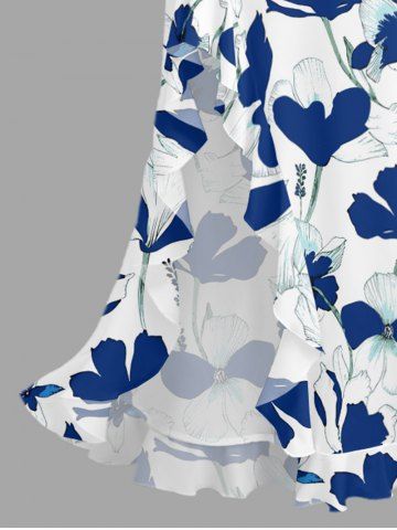 Flowers Leaf Tropical Print Hawaii Ruffles Split Surplice Dress - Blue - Xl