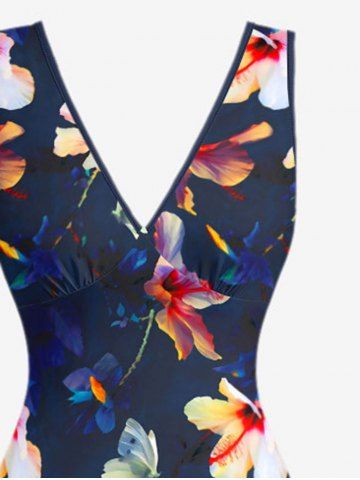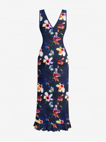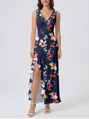 Flowers Print Hawaii Ruffles Split Surplice Dress - Deep Blue - Xs