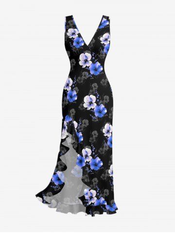 Flowers Print Hawaii Ruffles Split Surplice Dress - Black - Xl