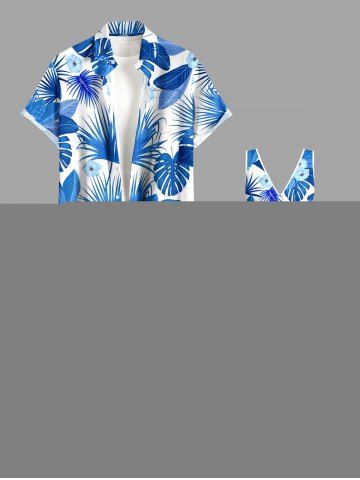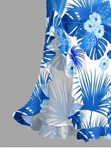 Flowers Tropical Leaf Print Hawaii Ruffles Split Surplice Dress - Blue - S