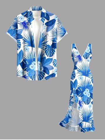 Flowers Tropical Leaf Print Hawaii Ruffles Split Surplice Dress - Blue - L