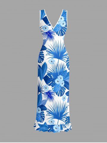 Flowers Tropical Leaf Print Hawaii Ruffles Split Surplice Dress - Blue - Xxxl