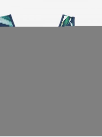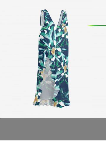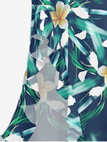Flowers Tropical Leaf Print Hawaii Ruffles Split Surplice Dress - Deep Blue - M