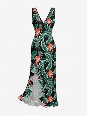 Graphic Dresses > Flowers Tropical Leaf Print Hawaii Ruffles Split Surplice Dress