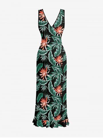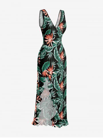 Flowers Tropical Leaf Print Hawaii Ruffles Split Surplice Dress - Black - L