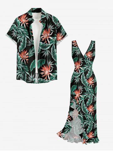 Flowers Tropical Leaf Print Hawaii Ruffles Split Surplice Dress - Black - Xxl