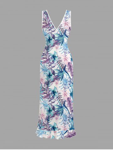 Flowers Tropical Leaf Print Hawaii Ruffles Split Surplice Dress - Light Purple - L