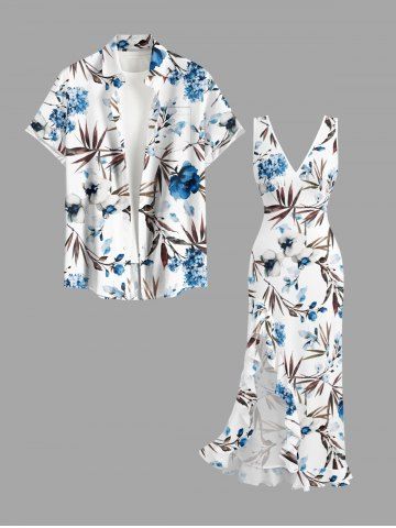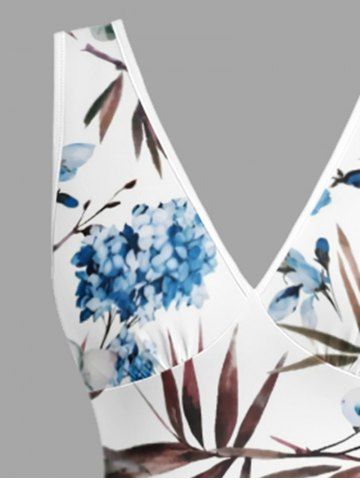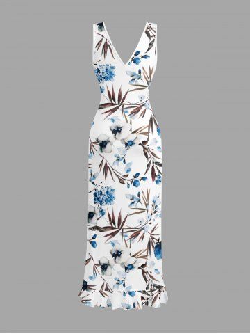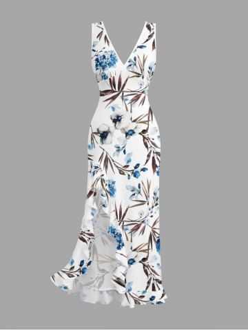 Flowers Tropical Leaf Print Hawaii Ruffles Split Surplice Dress - White - Xl