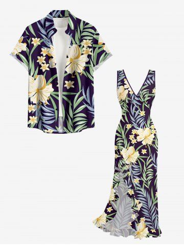 Flowers Tropical Leaf Print Hawaii Ruffles Split Surplice Dress - Deep Blue - M
