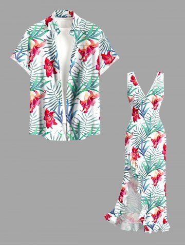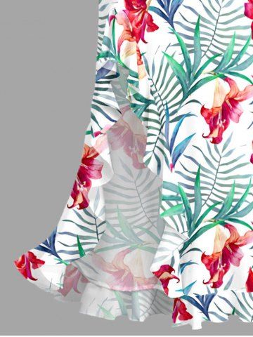 Graphic Dresses > Hibiscus Flower Leaf Print Hawaii Ruffles Split Surplice Dress