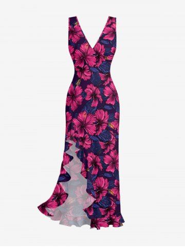 Hibiscus Flower Print Hawaii Ruffles Split Surplice Dress - Rose Red - L