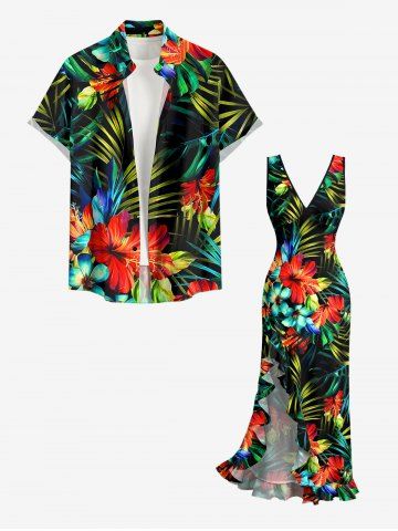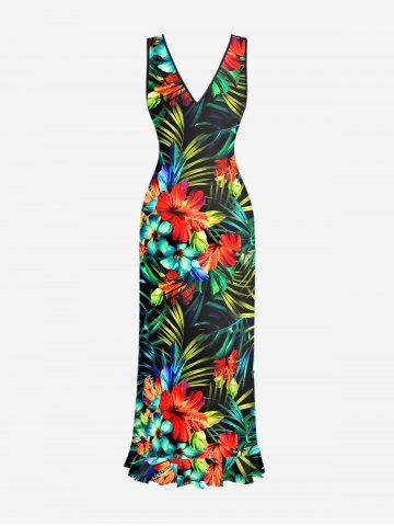 Graphic Dresses > Hibiscus Flower Tropical Leaf Print Hawaii Ruffles Split Surplice Dress