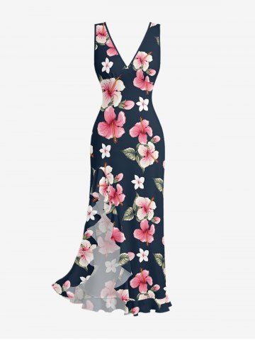 Hibiscus Flowers Leaf Print Hawaii Ruffles Split Surplice Dress - Deep Blue - Xs