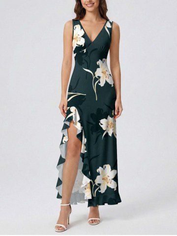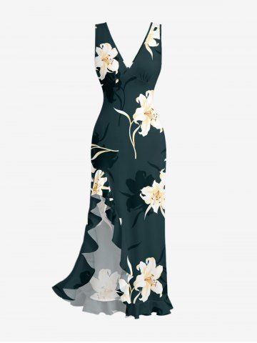 Graphic Dresses > Hibiscus Flowers Leaf Print Hawaii Ruffles Split Surplice Dress