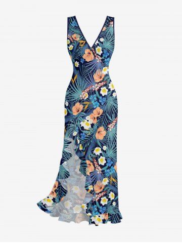 Hibiscus Flowers Tropical Leaf Print Hawaii Ruffles Split Surplice Dress - Deep Blue - Xxl