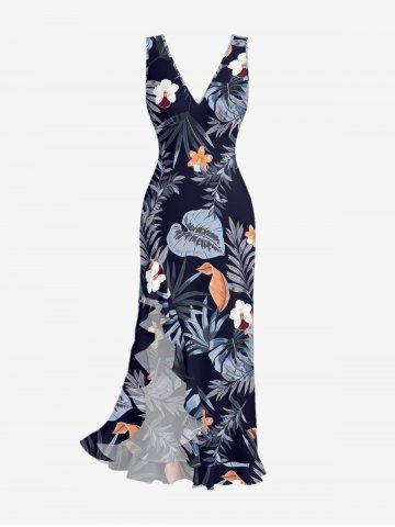 Graphic Dresses > Hibiscus Flowers Tropical Leaf Print Hawaii Ruffles Split Surplice Dress