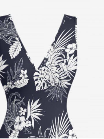 Hibiscus Flowers Tropical Leaf Print Hawaii Ruffles Split Surplice Dress - Deep Blue - M