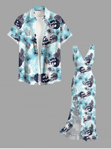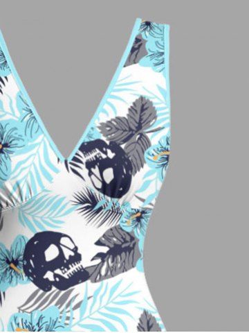 Hibiscus Flowers Tropical Leaf Skulls Printed Hawaii Ruffles Split Surplice Dress - Sky Blue - Xxl