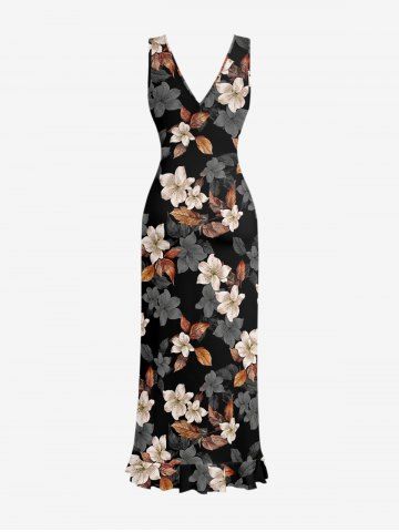 Leaf Flower Print Hawaii Ruffles Split Dress - Black - Xl
