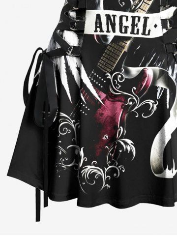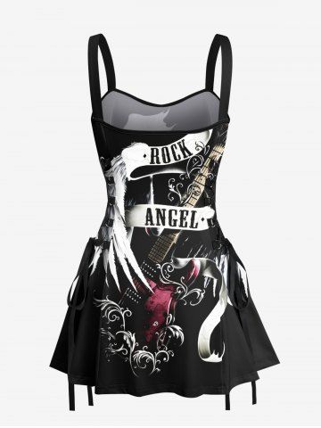 Music Festival Guitar Wings Ribbon Letters Print Lace Up Tank Dress - Black - M