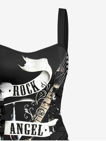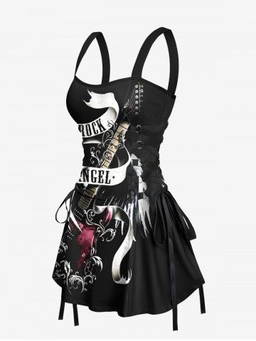 Music Festival Guitar Wings Ribbon Letters Print Lace Up Tank Dress - Black - Xl