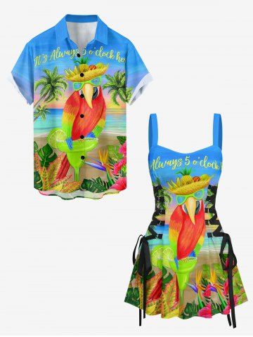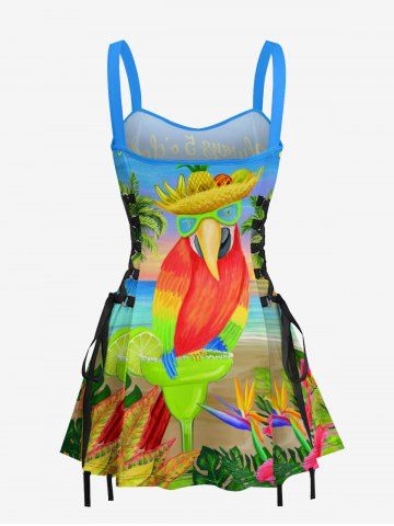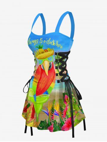 Parrot Coconut Tree Flowers Seascape Print Lace Up Hawaii Tank Dress - Sky Blue - Xl