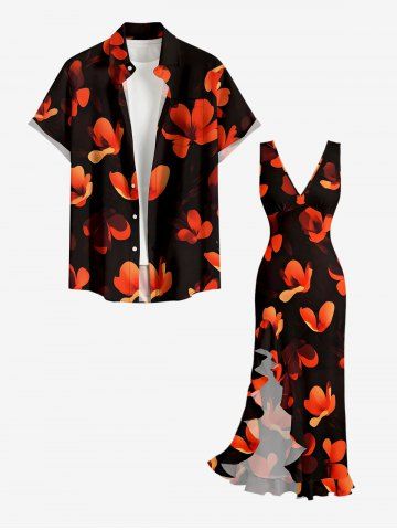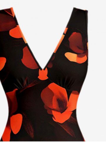 Petal Flower Print Hawaii Ruffles Split Dress - Deep Coffee - M