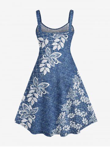 Plus Size 3D Embroidery Butterfly Floral Leaf Denim Print Hawaii A Line Tank Dress - Blue Gray - M