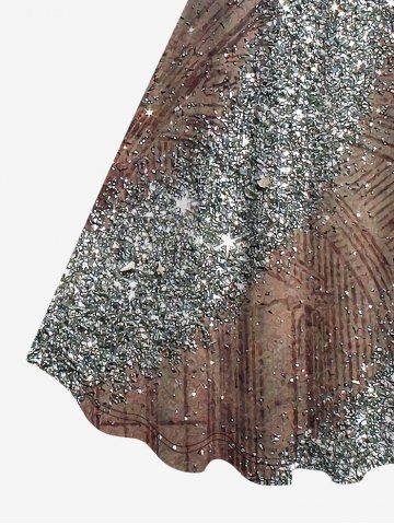 Plus Size 3D Glitter Sparkling Sequins Textured Distressed Newspapaer Print A Line Party Dress - Deep Coffee - 5x