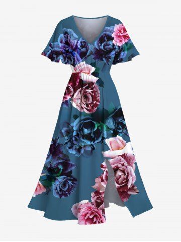 Plus Size 3D Ombre Flower Print Hawaii Split Pocket A Line Midi Dress - Blue - L
