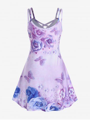 Graphic Dresses > Plus Size 3D Rose Butterfly Printed Criss Cross A Line Sleeveless Dress