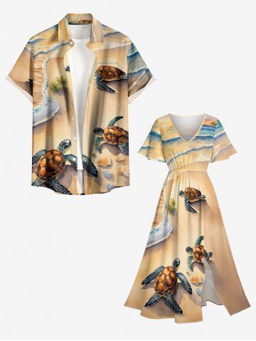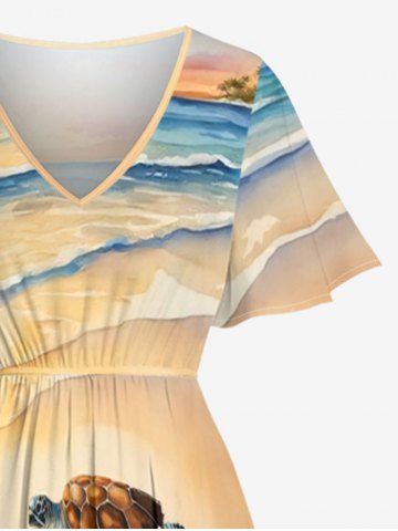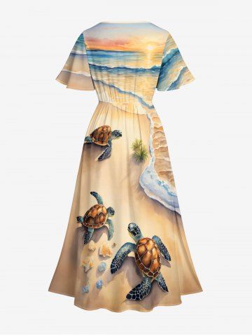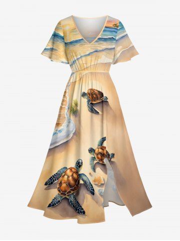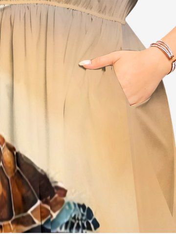 Plus Size Beach Sea Turtle Print Hawaii Sea Creatures Split Pocket A Line Midi Dress - Light Coffee - Xxs
