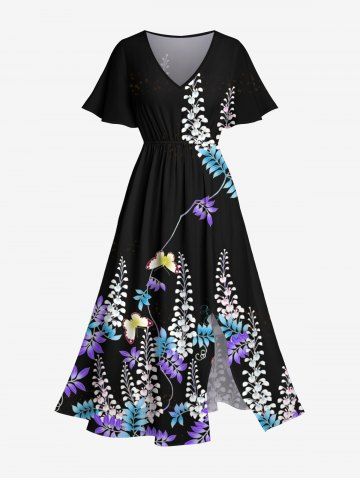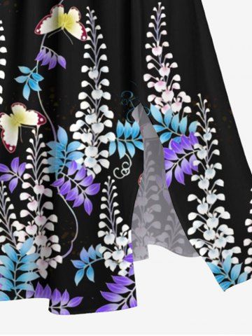 Plus Size Bell Orchid Flower Butterfly Leaves Branch Print Split Pocket A Line Midi Dress - Black - 2x