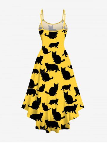 Plus Size Black Cats Print High Low Hawaii Cami Dress - Yellow - S