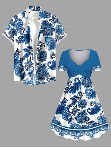 Plus Size Blue And White Porcelain Flower Leaf Print Cinched Hawaii Dress - Blue - Xxs