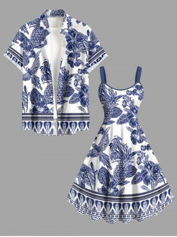 Plus Size Blue And White Porcelain Pineapple Hibiscus Flower Leaf Print Hawaii Tank Dress - Blue - Xxs