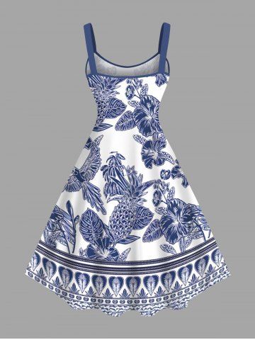 Graphic Dresses > Plus Size Blue And White Porcelain Pineapple Hibiscus Flower Leaf Print Hawaii Tank Dress