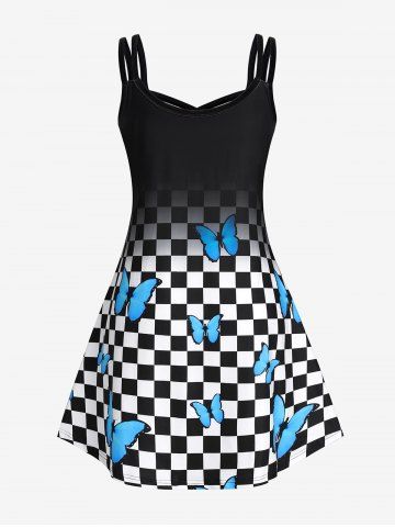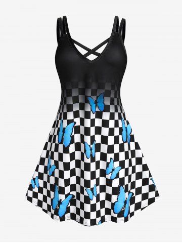 Graphic Dresses > Plus Size Butterfly Checkerboard Crisscross A Line Sleeveless Dress