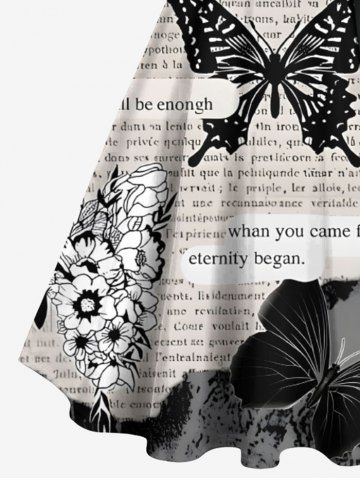 Plus Size Butterfly Plant Newspaper Print Button A Line Dress with Removable Belt - Black - 5x