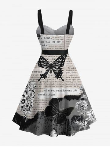 Graphic Dresses > Plus Size Butterfly Plant Newspaper Print Button A Line Dress with Removable Belt