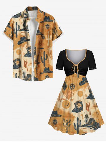 Plus Size Cactus Plant Hat Floral Desert Print Hawaii Cinched A Line Dress - Coffee - 6x