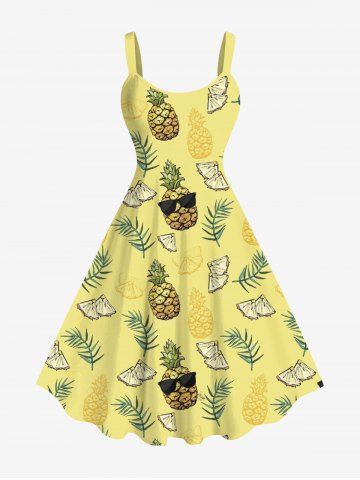 Plus Size Cartoon Pineapple Tropical Leaves Print Hawaii A Line Tank Dress - Yellow - 3x
