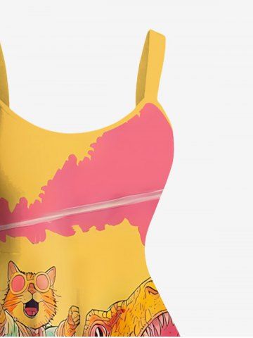 Plus Size Cat Dinosaur Cloud Colorblock Print Hawaii Tank Dress - Yellow - 2x